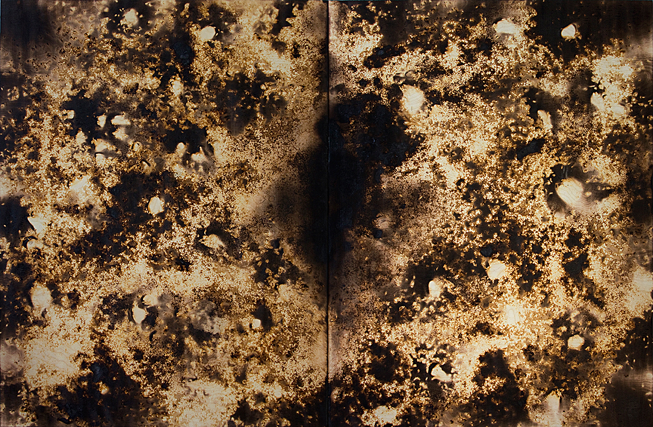 Michael Watson, Body II, charred rice residue on charred birch plywood, 2014, 48 x 72