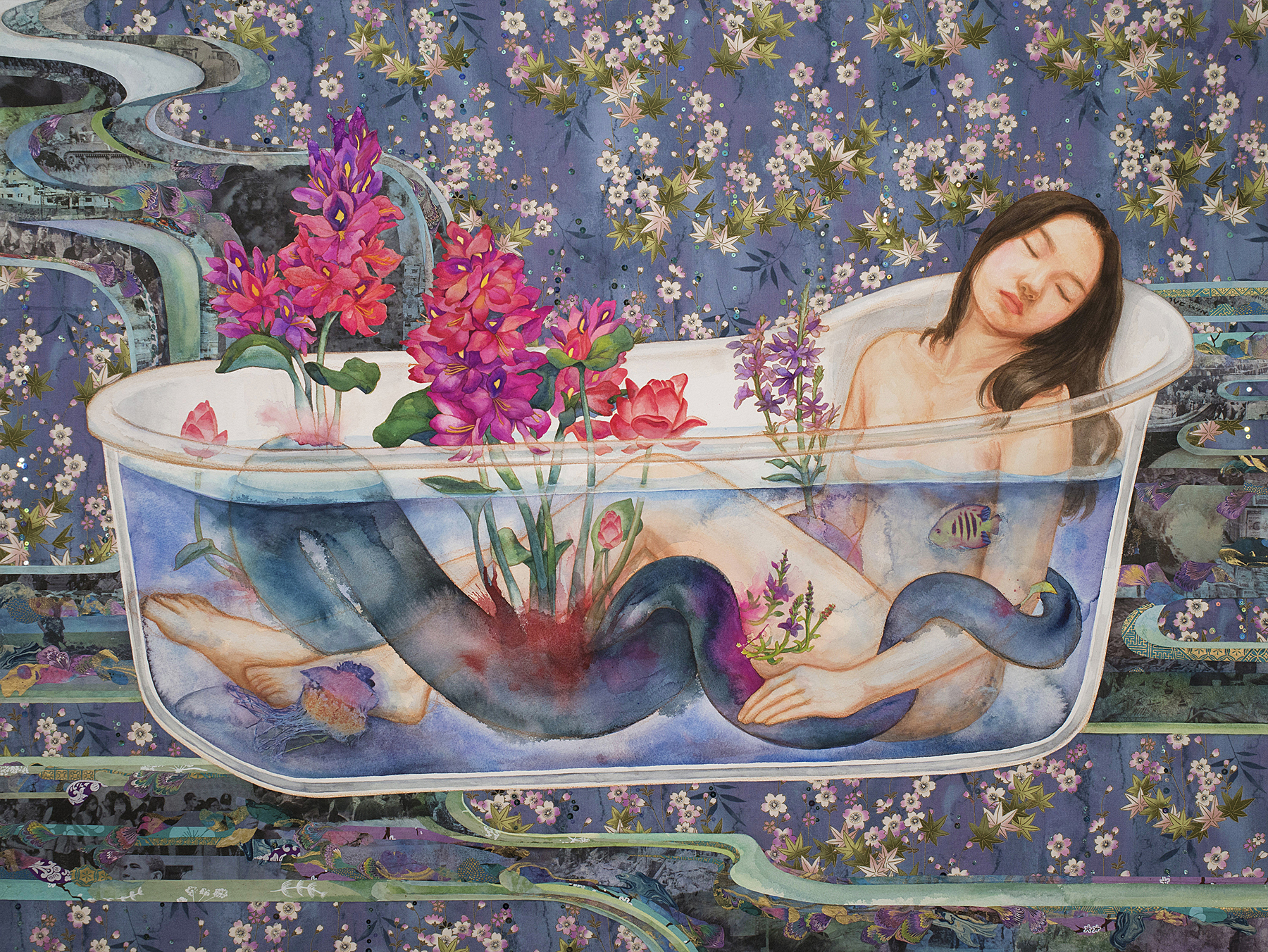Suyeon Na, Flow, watercolor, gouache, collage on paper, 2015, 36x48