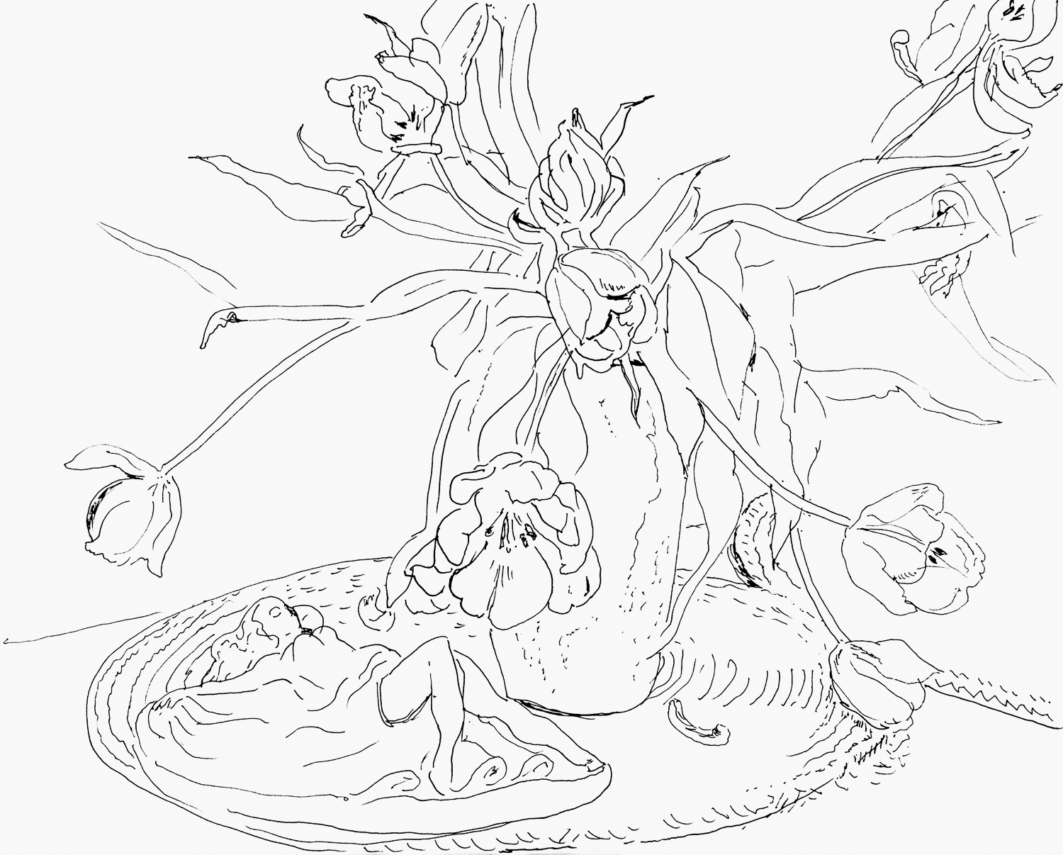 Still Life with Ashtray and Tulips, ink drawing